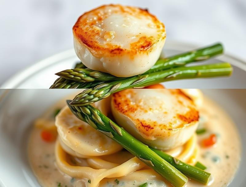 A sophisticated dish featuring perfectly seared scallops served with tender asparagus in a rich, creamy sauce that embodies the flavors of the coast.