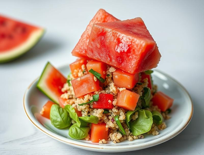 A refreshing salad combining the sweetness of watermelon with the nuttiness of quinoa, perfect for summer gatherings.